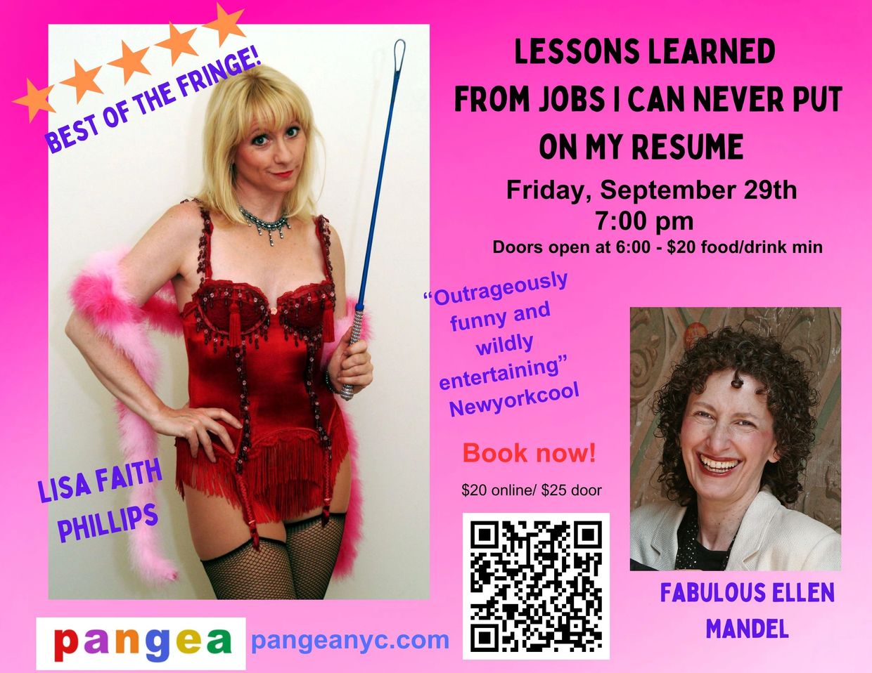 Now Ellen Mandel and I are excited to bring the full new show of comedy and song Lessons Learned from Jobs I Can Never Put on my Resume (Version 2.0). Laugh out loud at the lessons I learned from working as a stripper, performing phone sex, being a back-up dancer for Bette Midler and Mick Jagger, a night in jail and being sued for my comedy musical, 7 1/2 Habits of Highly Effective Mistresses. With the fabulous composer and songwriter Ellen Mandel on piano.